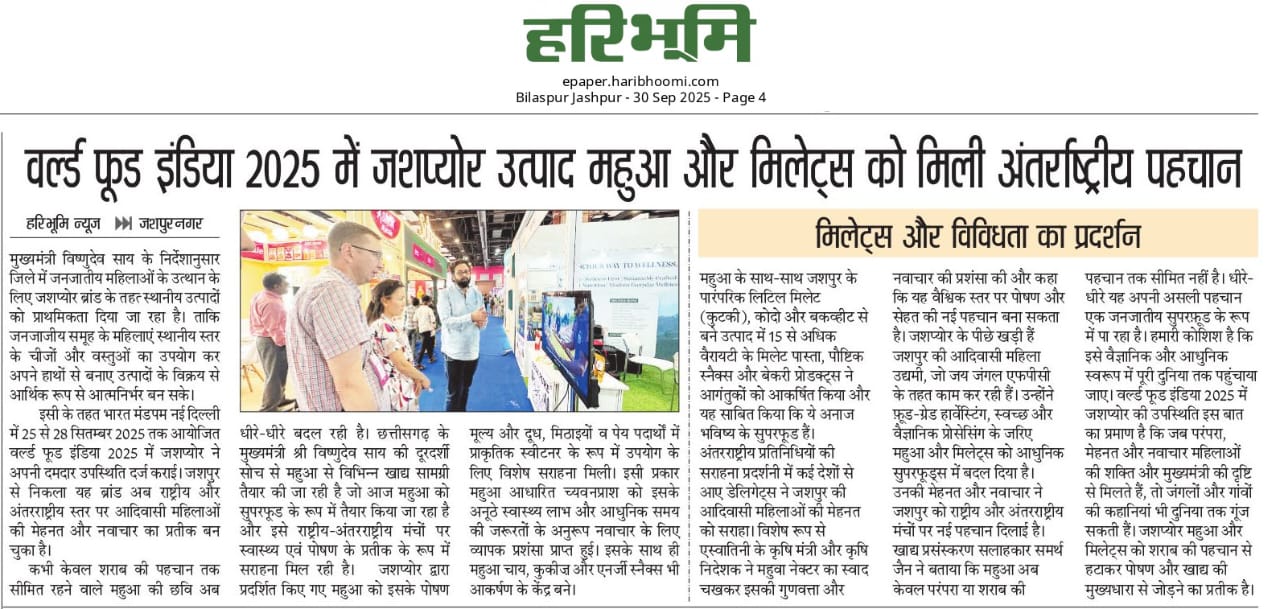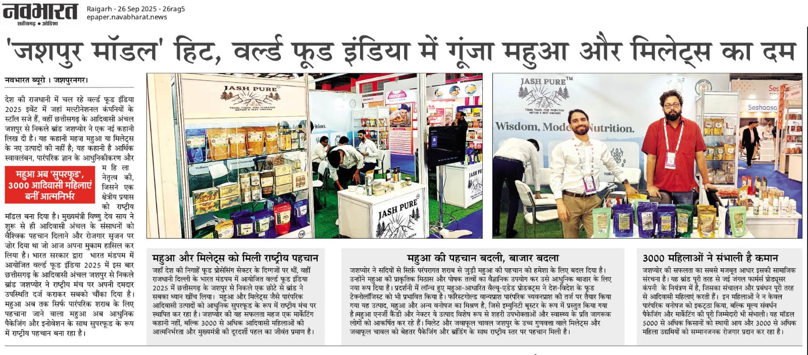 Tribal women of Jashpur are rewriting history with Mahua. s+ From forest to market, the JASHPURE brand is empowering communities, creating livelihoods, and restoring pride in tribal culture as featured in Navbharat (18 Sept 2025).