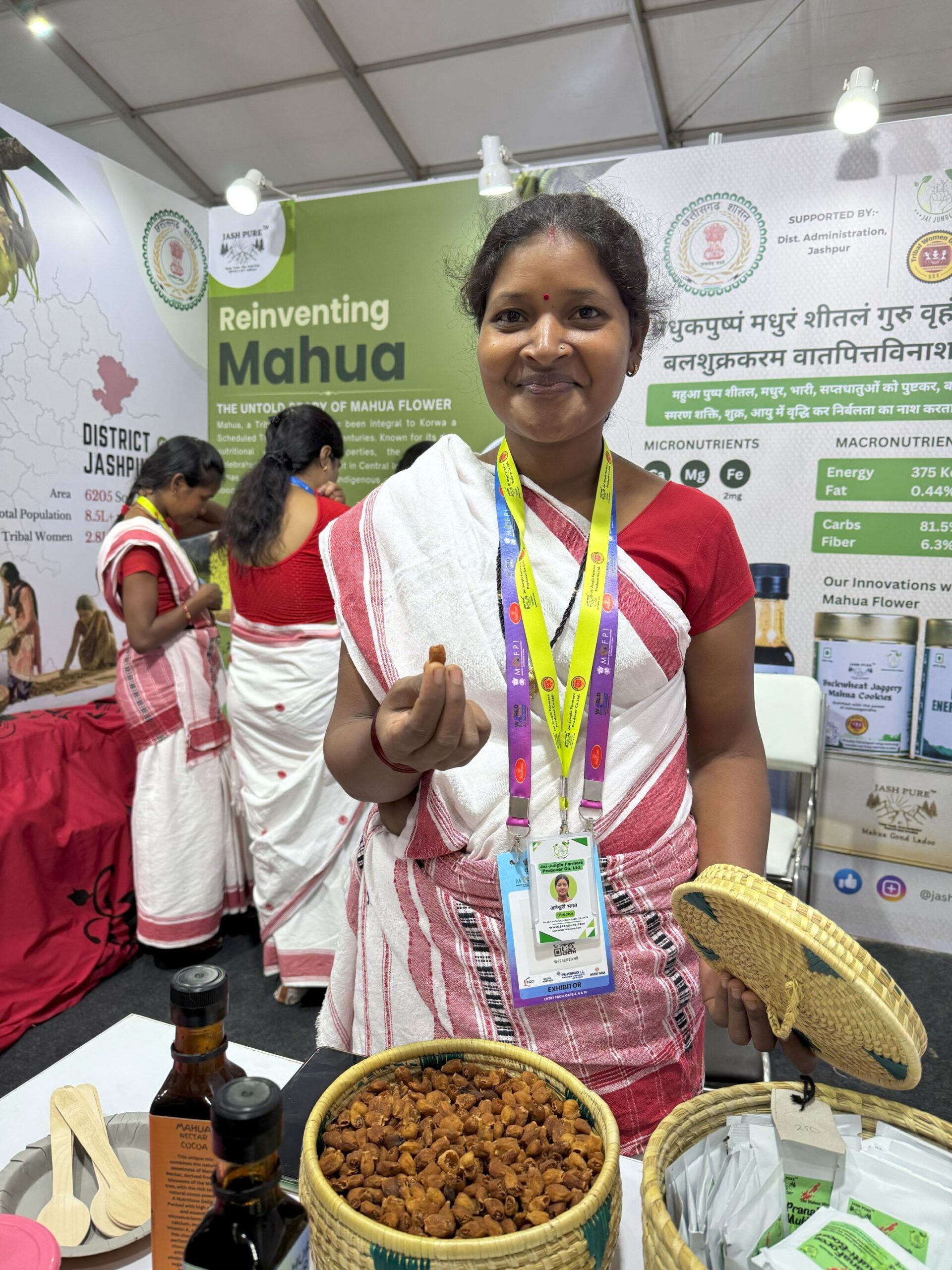 Her presence symbolizes women-led tribal entrepreneurship, the revival of indigenous superfoods, and the empowerment of rural communities in Jashpur. The stall showcased Jai Jungle Mahua innovations such as nectar, laddoos, teas, and cookies, marking the global debut of Jashpur’s forest-based heritage