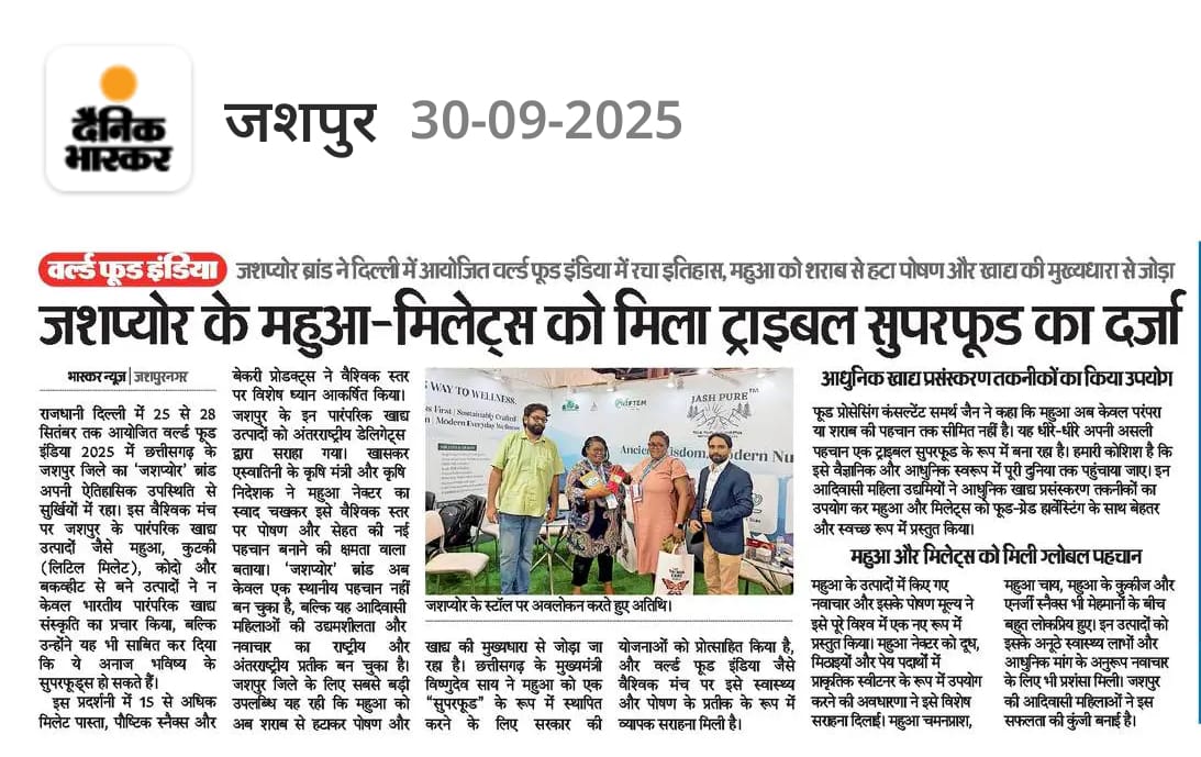At World Food India 2025, JASHPURE showcased Mahua and millets, redefining them as nutritious superfoods, promoting tribal heritage, empowering women, and securing international recognition for Jashpur’s communities.