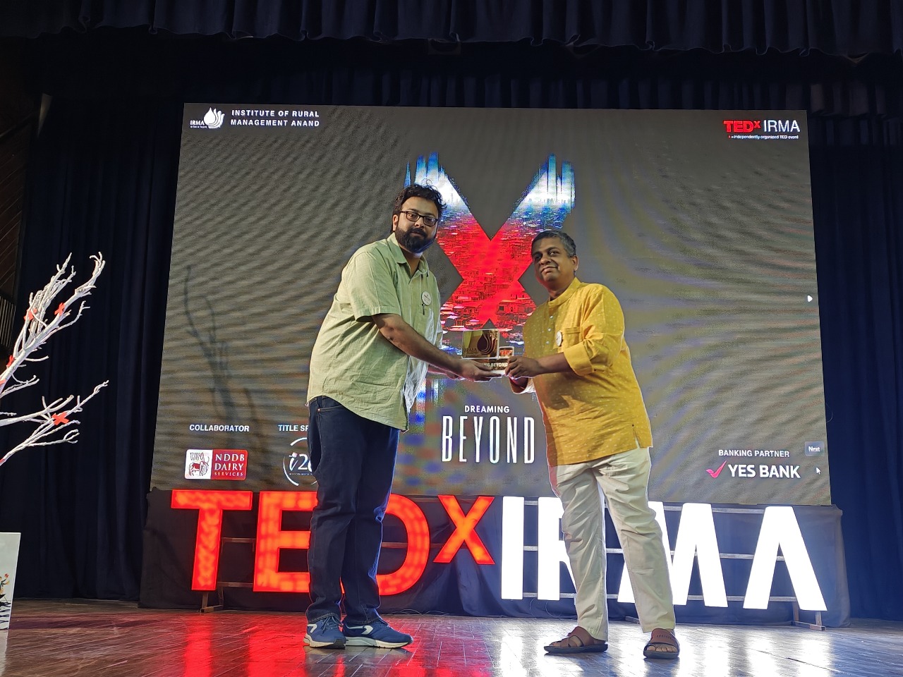 Samarth Jain being honored with a momento after delivering a TEDx Talk on Mahua, hosted by IRMA, Anand. The talk focused on how Mahua, a sacred yet forgotten forest flower, is being reinvented through science and tribal entrepreneurship. By blending Ayurveda, modern nutrition, and women-led enterprise, the session highlighted how Mahua can emerge as India’s next global superfood while empowering thousands of tribal women in Jashpur