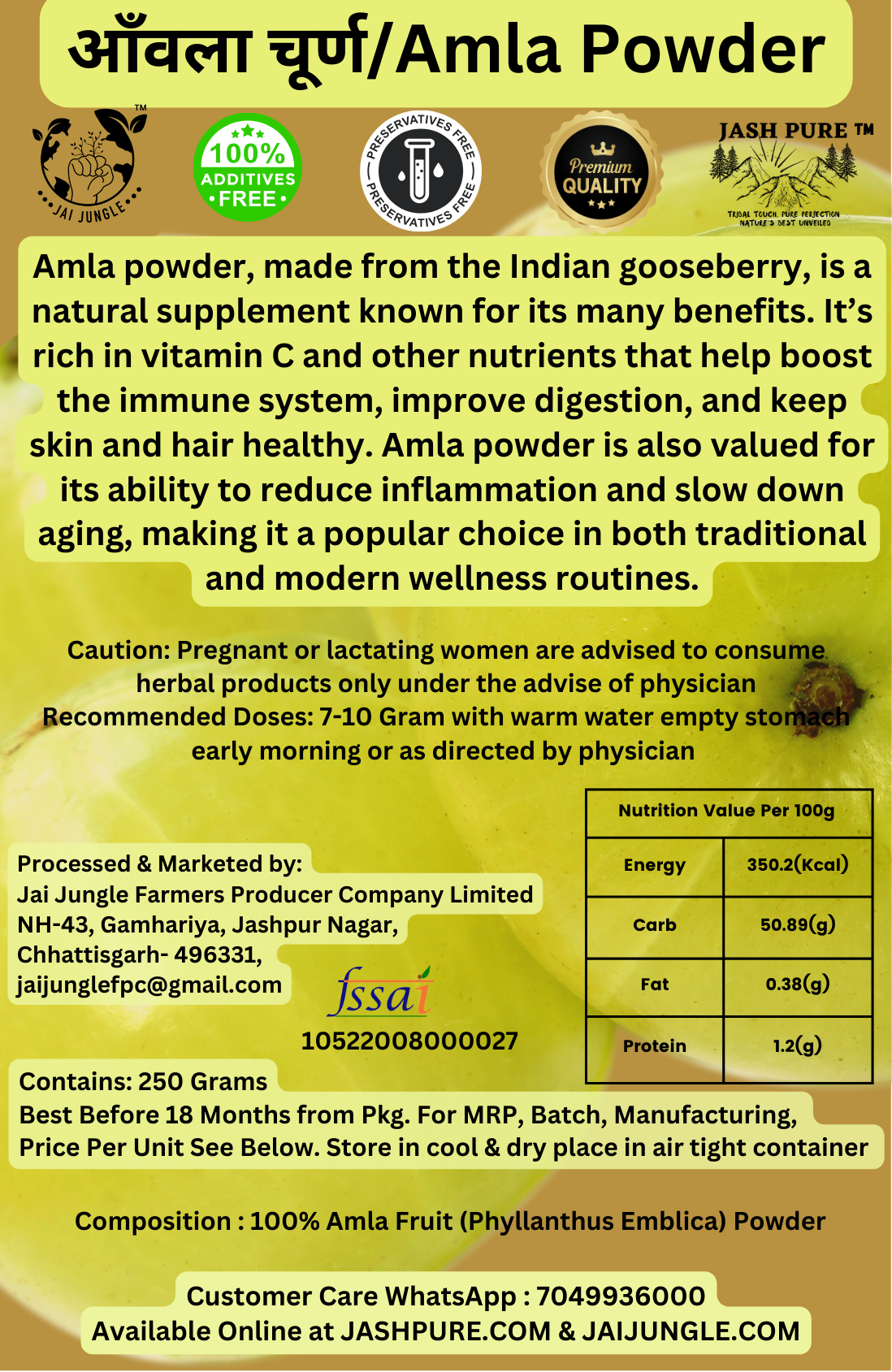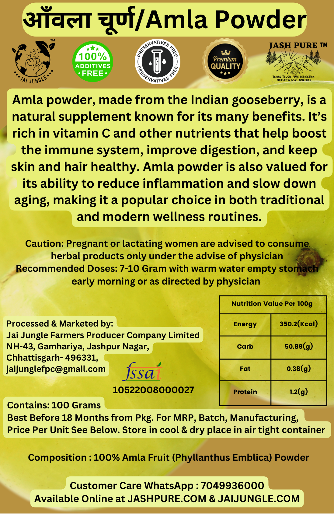 The Amla fruits are shade-dried and finely powdered without any preservatives, artificial colors, or additives. Therefore, Jai Jungle delivers a clean label product that preserves the authenticity of this traditional fruit.