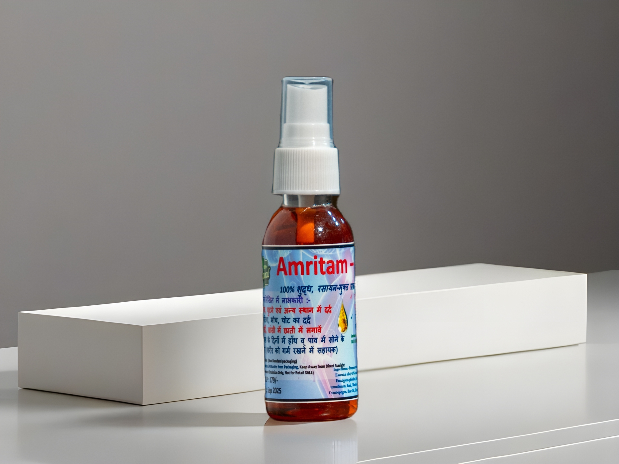Amritam is a chemical-free, therapeutic oil blend designed for effective pain relief and body rejuvenation. Crafted with the wisdom of ancient Ayurvedic principles and backed by the modern science of essential oils, this unique oil-in-oil emulsion penetrates deep into muscles and joints, providing long-lasting warmth and comfort — naturally.