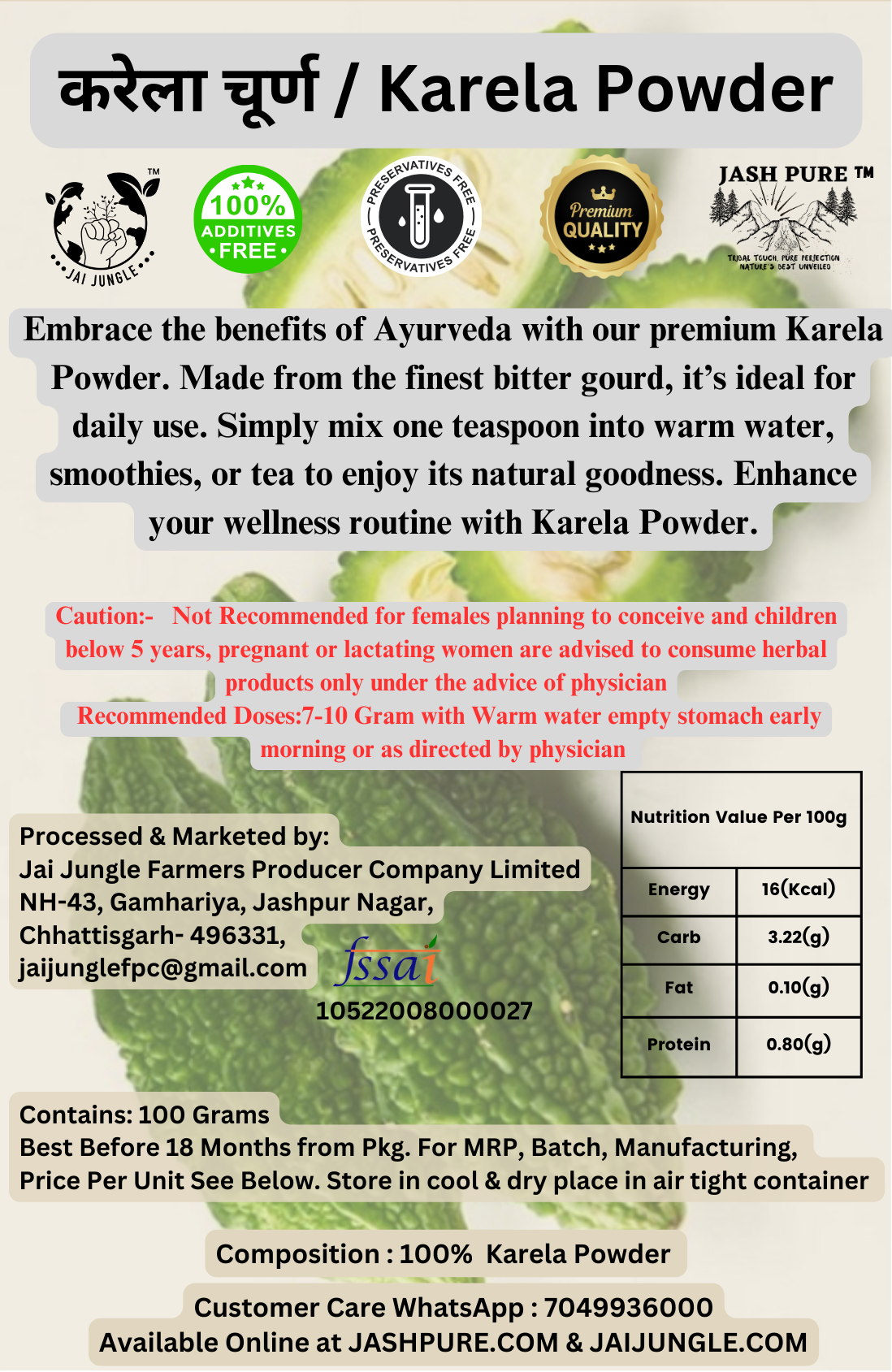 The karela is gently shade-dried and ground without preservatives, artificial colors, or chemicals. Therefore, Jai Jungle delivers a clean label powder aligned with traditional food practices.