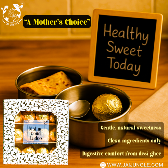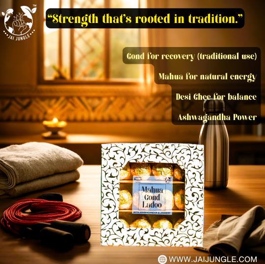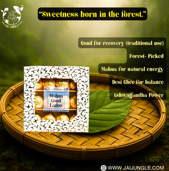 Mahua Gond Desi Ghee Ladoo (No Added Sugar | With Ashwagandha) – A power-packed tribal superfood made with Mahua flowers, gond, pure desi ghee, and Ashwagandha. Handcrafted by tribal SHG women in Jashpur, these ladoos provide natural energy, stamina, and immune support without refined sugar or preservatives.