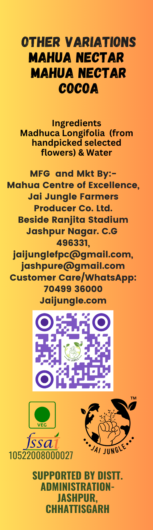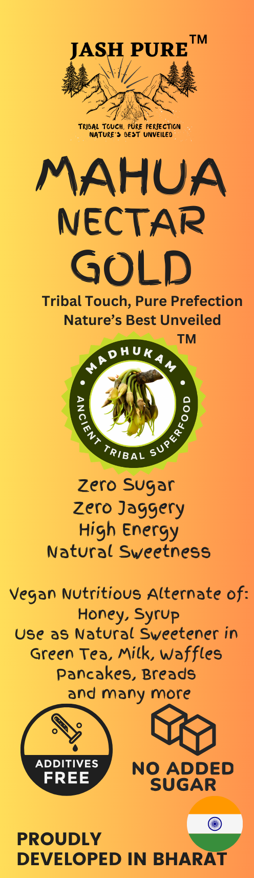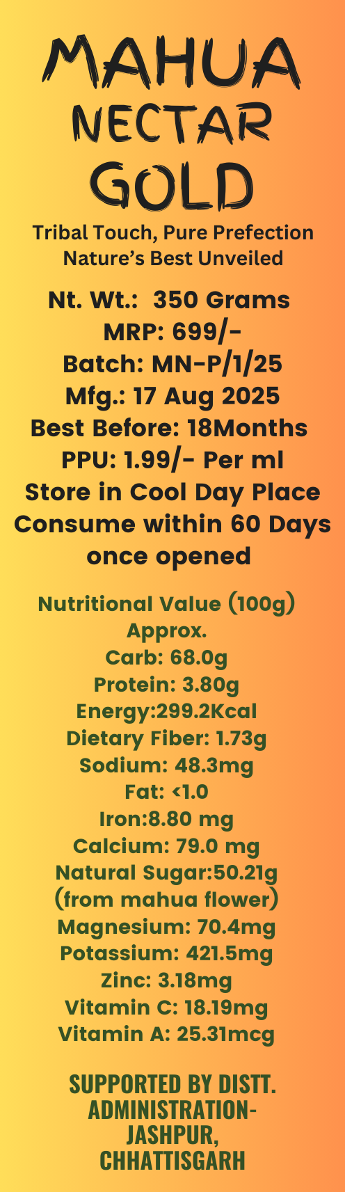 Handcrafted by tribal SHG women of Jashpur, Mahua Nectar Gold is chemical-free, preservative-free, and zero jaggery, offering a clean-label promise you can trust. With its high mineral and vitamin profile, it stands apart as a luxury wellness tonic – whether as a morning energizer, a pre-workout boost, or a natural sweetener in tea, coffee, pancakes, and smoothies.