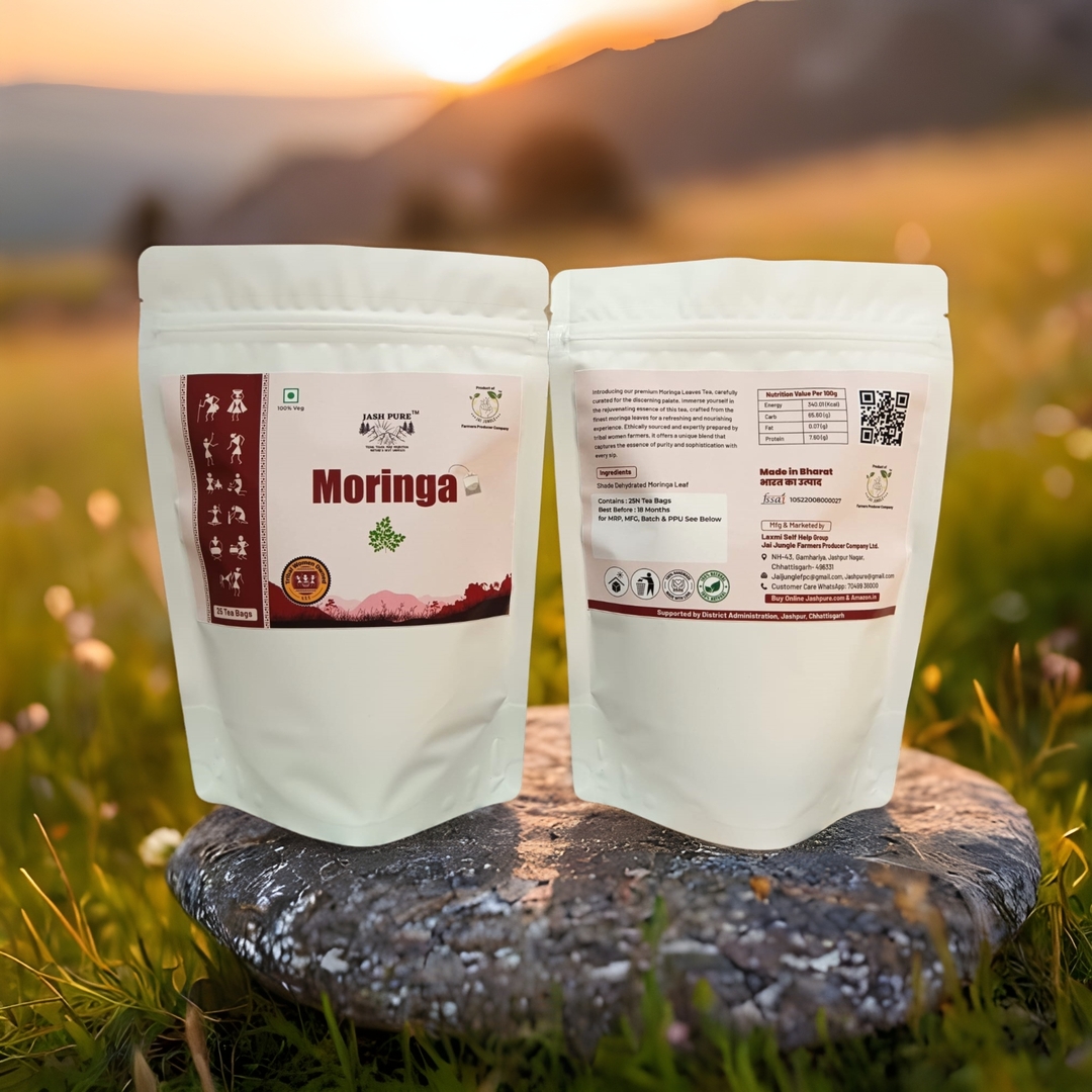 Discover the goodness of Moringa Tea Bags – a pure herbal infusion crafted by tribal women of Jashpur. Made from shade-dehydrated moringa leaves, this tea preserves its natural nutrients, aroma, and flavour. Packed into 25N individually sealed tea bags, it ensures freshness, hygiene, and daily convenience. A caffeine-free way to add superfood wellness to your lifestyle.