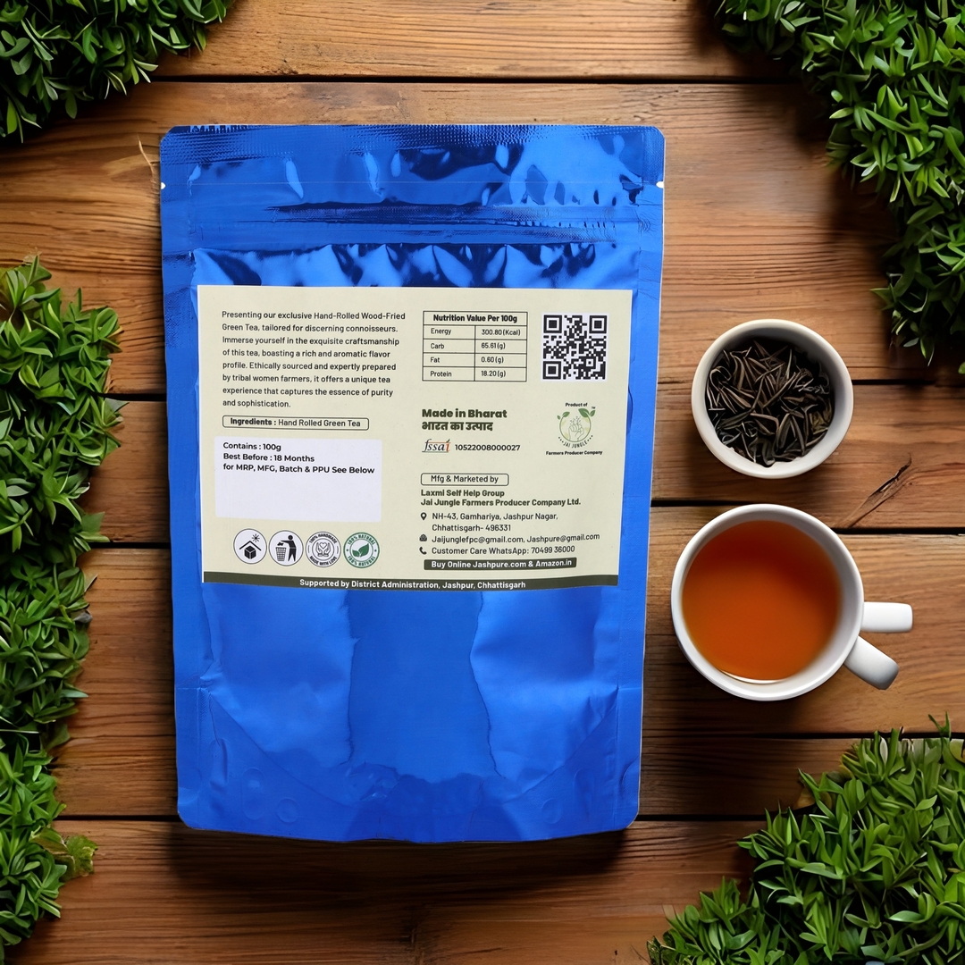 Experience the authentic taste of the Jashpur mountains with Jai Jungle’s Premium Green Tea 🍵. Sourced from one of the first tribal-owned tea gardens of central India, this small-batch green tea is hand-rolled and wood-fired to preserve its natural oils, aroma, and flavour. A true artisanal tea, it is carefully shade-dried and packed loose, offering you the freedom to brew to your taste.