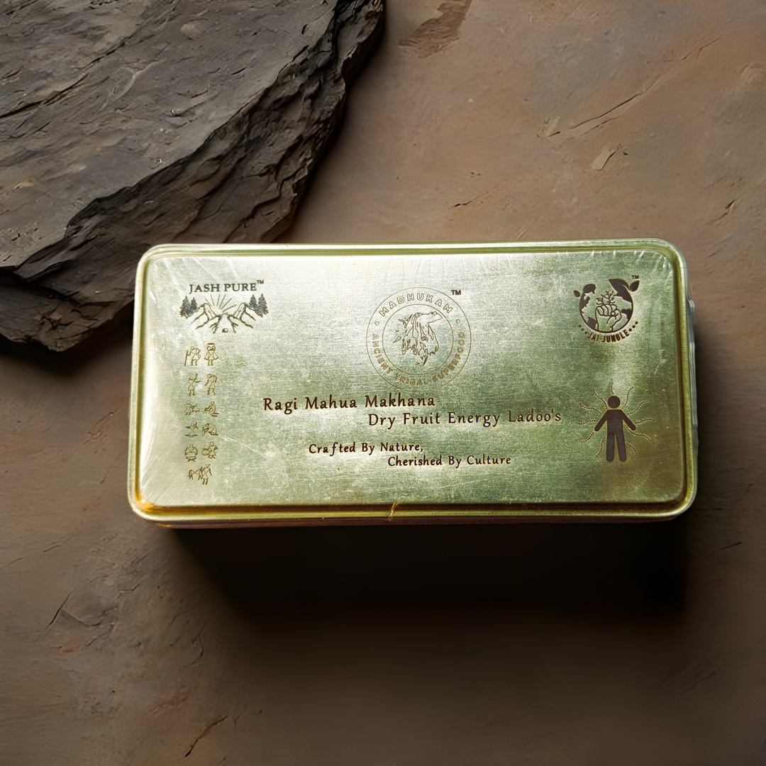 Ragi Mahua Makhana Ladoo – A gluten-free, no-refined sugar superfood snack made with ragi, sun-dried Mahua flowers, makhana, dry fruits, and seeds. Infused with Ashwagandha for energy and stress relief, these ladoos are handcrafted by tribal women — a healthy, kid-friendly, and diabetic-friendly alternative to sugar-loaded sweets.